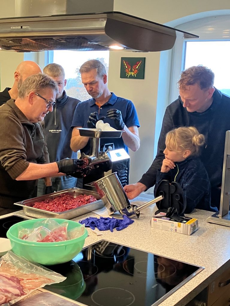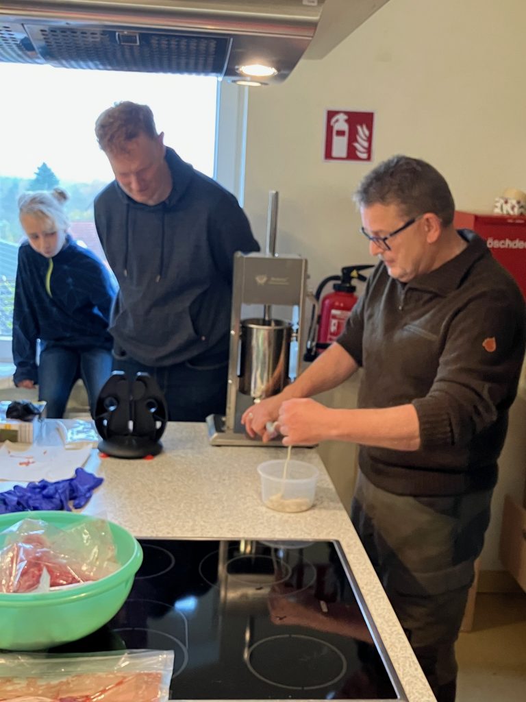 Zu Beginn wurden die Grundzutaten vorbereitet: Wildfleisch aus dem eigenen Revier – Wildschwein und Reh. Regionaler geht es kaum! Praxisnah führte Gunnar die Teilnehmenden in die Geheimnisse des Wurstens ein: Hackfleisch richtig durchkneten, Luft aus der Masse schlagen, den Wurstdarm korrekt füllen, Würste sauber eindrehen – und dabei immer wieder hilfreiche Tipps und Tricks aus dem Metzgerhandwerk. Auch das richtige Schärfen von Messern und der Umgang mit dem Fleischwolf standen auf dem Programm.